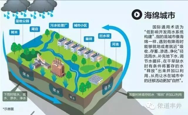國(guó)際通用術(shù)語(yǔ)為“低影響開發(fā)雨水系統(tǒng)構(gòu)建”,指的是城市像海綿一樣,遇到有降雨時(shí)能夠就地或者就近“吸收、存蓄、滲透、凈化”徑流雨水,補(bǔ)充地下水、調(diào)節(jié)水循環(huán),在干旱缺水時(shí)有條件將蓄存的水“釋放”出來并加以利用,從而讓水在城市中的遷移活動(dòng)更加“自然”。